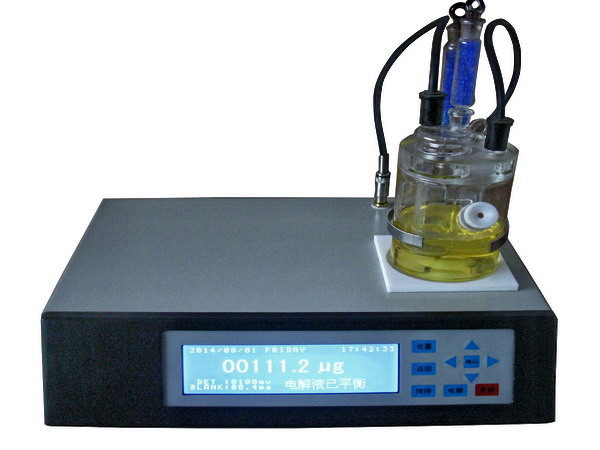 如果電解池還是處于深度過碘狀態,用50ul微量進樣器每次抽取10ul的蒸餾水,用濾紙擦拭一下針頭,按一下啟動鍵,通過進樣旋塞中間的孔分多次注入到電解池液面以下,隨時注入隨時觀察電解液的顏色變化,直到電解液變成淡黃色,測量信號燈和電解信號燈綠燈有指示,計數器開始計數為止。(用新鮮的電解液,并且池瓶是干燥的情況下,大約需要注入30~50ul的水。)待計數停止,再停止攪拌,拿起電解池輕輕晃動幾下,再次使池瓶內壁上的水分被吸收,終點報警后即可進行標定。(剛換上的電解液有時不太穩定,這時可再注入大約2~3ul的蒸餾水,使其計 2000~3000ug的數字,這樣便于更快穩定。)
