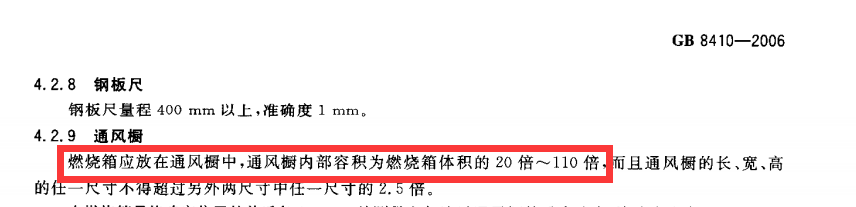 2.GB8410-2006要求燃燒箱放置在通風(fēng)櫥內(nèi),通風(fēng)櫥容積為燃燒箱體積的20倍-110倍,LGD-3QCS型儀器燃燒室尺寸為385*204*360mm,通風(fēng)櫥尺寸為1050mm×640mm×1300mm,實際通風(fēng)櫥容積為燃燒箱體積的約30倍,絕無偷工減料、完全符合標(biāo)準(zhǔn)要求。